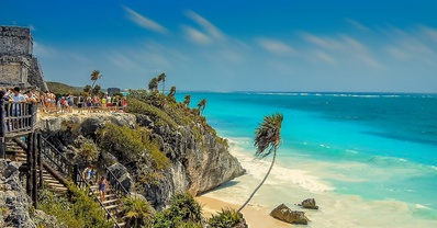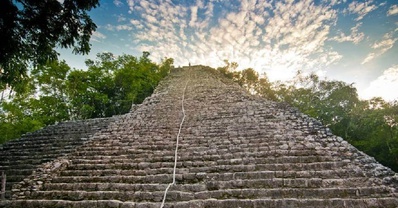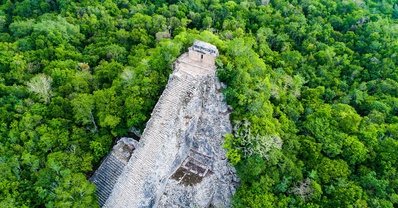 As we continue, we will visit another beautiful archeological site: Coba. This historical site was also inherited by the Mayan Culture. The main temple Nohoch Mul is an impressive 42 meters tall, it will feel as though you can touch the top of the temple with your fingers from up high. To end your journey, you will witness the majestic jungle that guards all the secrets for the civilization that brought forth the Mexican culture. You will see the beautiful blue ocean in the background as you fly away.